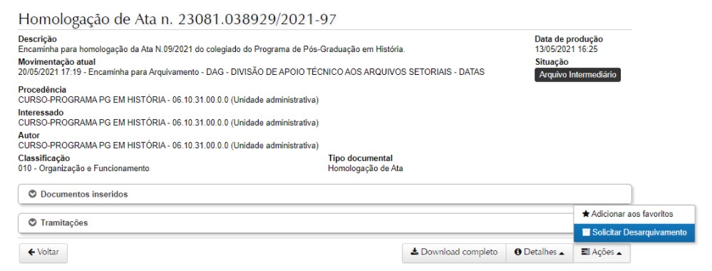 Os usuários logados podem solicitar o desarquivamento na página do processo, basta clicar em “Ações” e nas opções apresentadas clicar em “Solicitar desarquivamento”.