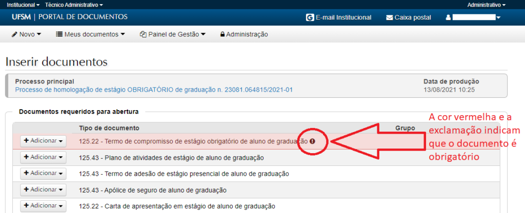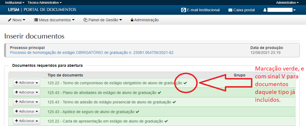 Após o documento obrigatório ter sido incluído, ele passa a ficar com a marcação verde e com o sinal V.