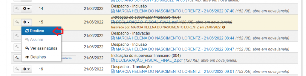Para melhor gerenciamento e usabilidade do sistema de processos PEN-SIE agora foi incluída uma nova opção na coluna “Ações” dos documentos inseridos: REATIVAR.