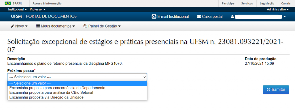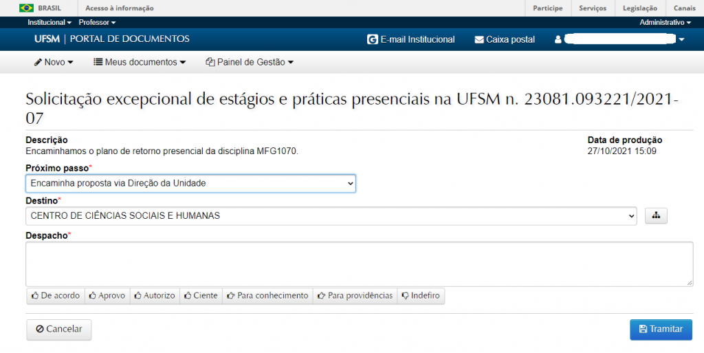 • Após retorno da manifestação do Departamento para o Curso, abrirá a opção de envio à CBio.