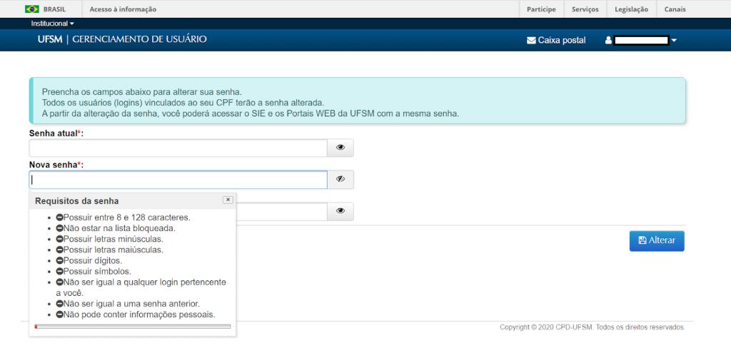 5. A senha é a mesma utilizada para o SIE e todos os Portais Web da UFSM. A nova senha deve seguir as novas regras de segurança estabelecidas.