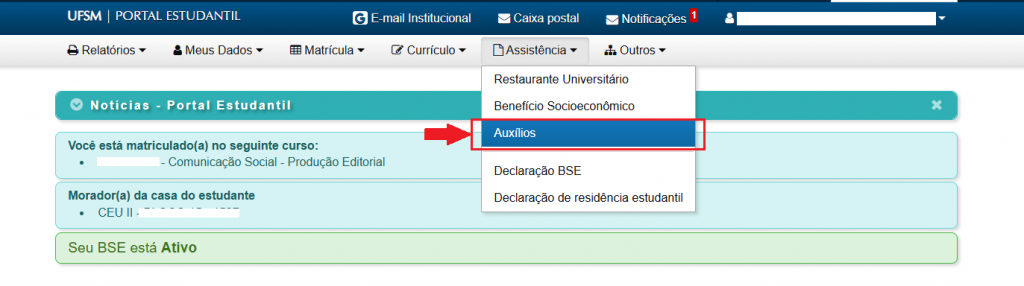 2 – No menu “Assistência” do Portal Estudantil, selecionar a opção “Auxílios:
