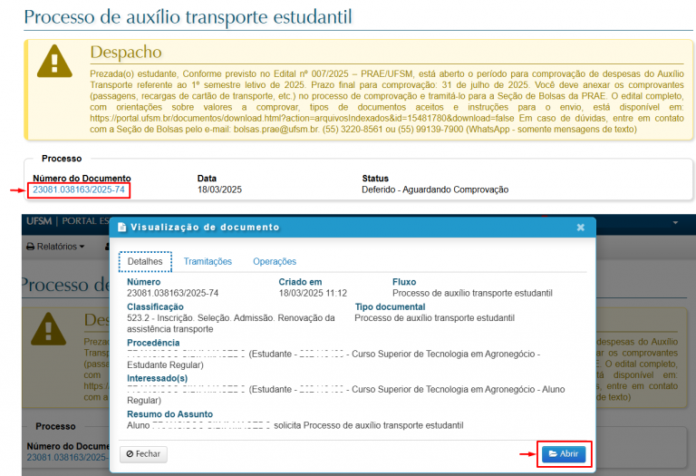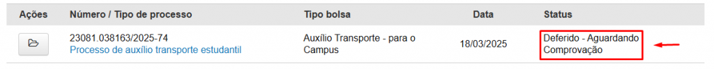 12 – Acompanhe o Status de andamento e consulte seu ‘Processo de auxílio transporte estudantil’, acessando a Aba ‘Auxílios’ do Portal Estudantil.