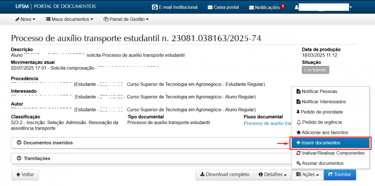 17 – Na tela do processo do Portal de Documentos, clique no botão “Ações” e “+Inserir documentos“.