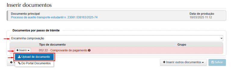 18 – Selecione o passo “Encaminha comprovação“. Após clique em “+Inserir” e selecione “Upload de documento” para enviar a comprovação da despesa.