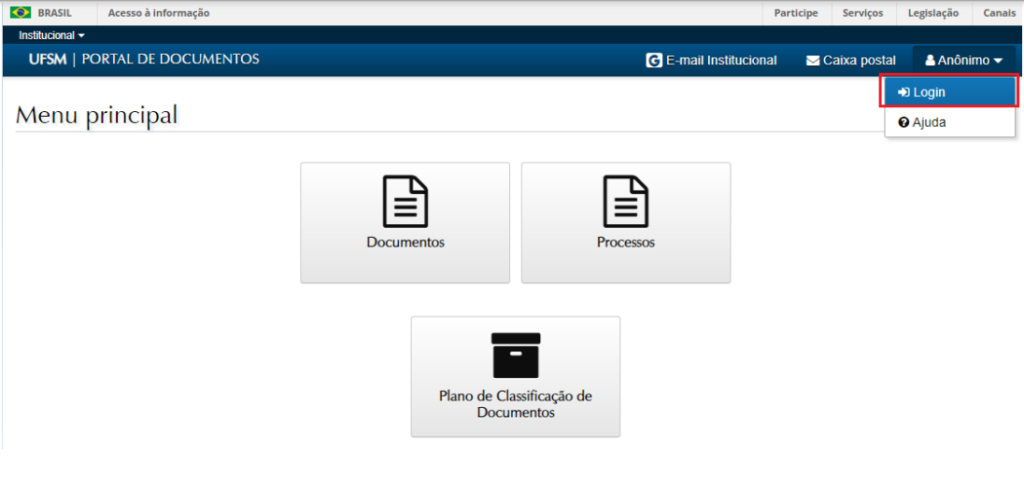 1. Acessar o Portal Documentos e efetuar o login, com o número da matrícula e a senha do portal do aluno.