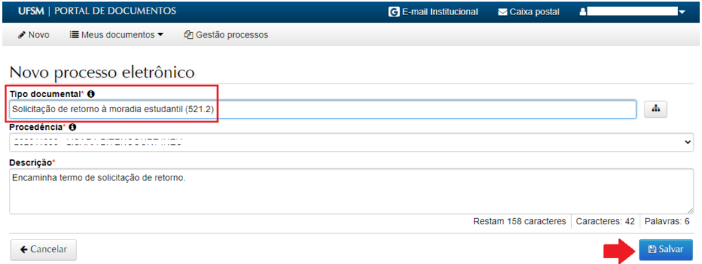 3. No campo “Tipo Documental”, procurar e selecionar ‘Solicitação de retorno à moradia estudantil (521.2)’ e, após, clicar em “Salvar”.