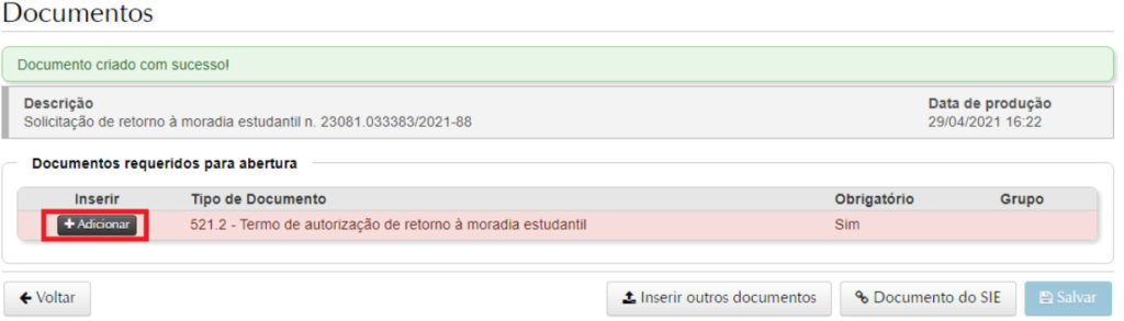5. Na tela ‘Documentos’ já aparecem quais os documentos são obrigatórios, sendo que não é possível avançar sem que estes sejam incluídos (Modelo do Termo de Solicitação de Retorno CEU), que deve ser preenchido e salvo em PDF). Para adicionar, você deve clicar no ícone “+Adicionar“, que aparece à frente do documento.