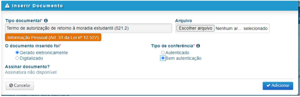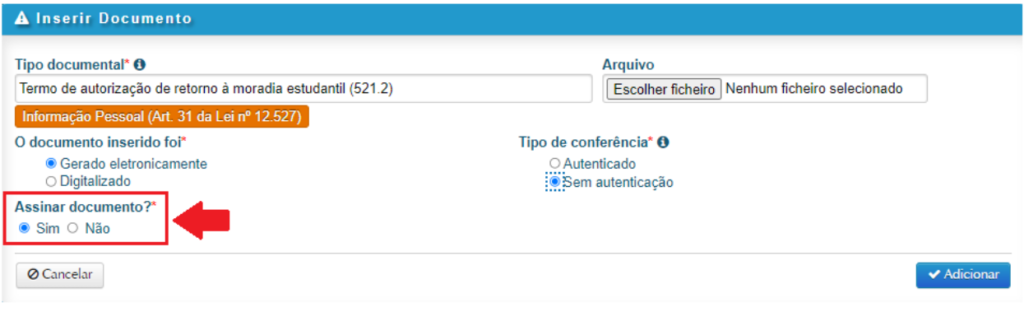 6.8. Caso você já tenha cadastrado sua assinatura no Portal Usuário (AQUI), já estará habilitada a chave de assinatura. Nesse caso, basta selecionar a opção ‘Sim‘ em Assinar documento. Após preenchidos os campos, clicar em ‘Adicionar’: