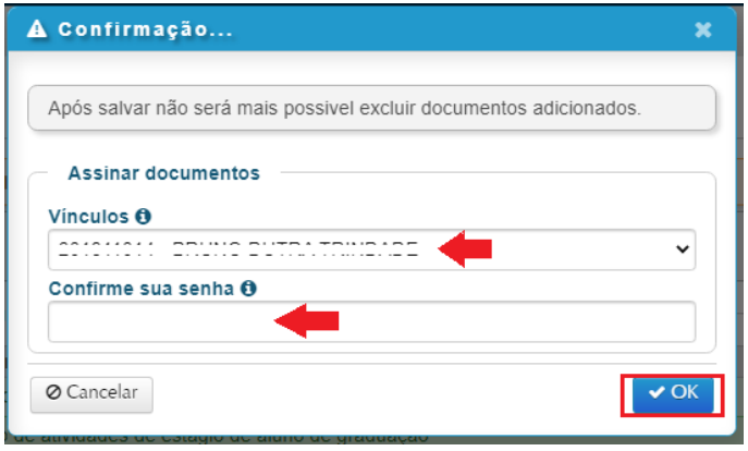 7.1. Se você selecionou a opção ‘Assinar documentos’, após Salvar será solicitada a confirmação de suas credenciais. Selecione o vínculo, confirme a sua senha e clique em OK.