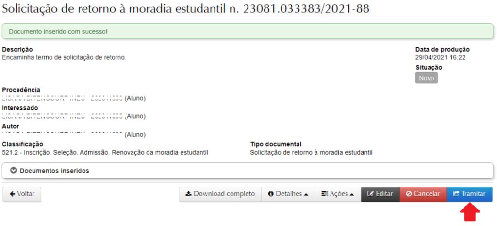 8. Para dar andamento ao processo, basta selecionar a opção ‘Tramitar’.