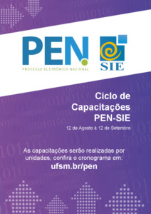 O Processo Eletrônico Nacional (PEN) está sendo implementado na Universidade Federal de Santa Maria através de plataforma Web do Sistema de informações para o Ensino (SIE) no endereço https://portal.ufsm.br/documentos. Será realizado pelo Departamento de Arquivo Geral um Ciclo de Capacitações no 2º semestre de 2019, para que a comunidade interna da UFSM conheça as funcionalidades do sistema e a regras do Processo Eletrônico. Serão realizadas demonstrações e exemplificações do PEN-SIE, e sanadas dúvidas e questões levantadas pelos participantes.