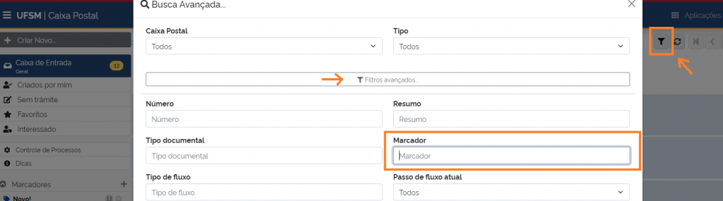 É possível filtrar processos por marcadores que não sejam seus, ou seja, criados por outros usuários que também possuem acesso ao processo na mesma unidade. Para isso existem duas opções: criar um marcador pessoal com o mesmo ou buscar o marcador desejado através do filtro personalizado da caixa postal disponível na barra superior.