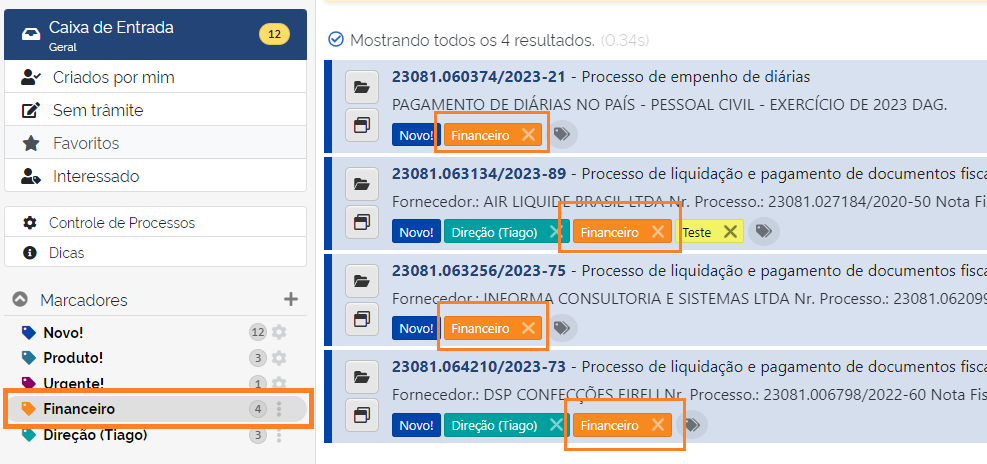 Os marcadores criados por você sempre ficarão disponíveis na aba lateral da caixa de entrada com uma indicação da quantidade de processos para cada marcador, basta clicar sobre o marcador para filtrar. Na lista aparecerá somente os processos associados ao marcador selecionado.