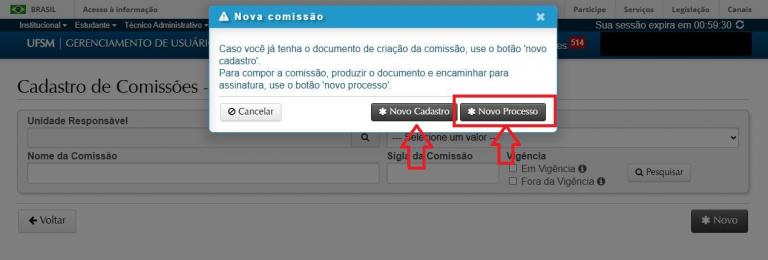 2 – Ao clicar no Cadastro de Comissões poderão ser abertas duas telas, a depender das permissões do usuário no SIE: