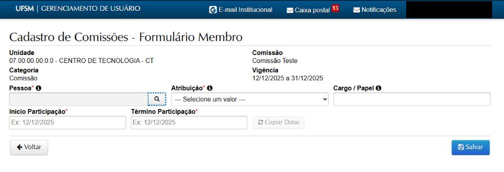 OBS: Não é possível excluir membros, caso o membro não faça mais parte da comissão, é necessário incluir uma data de término da participação.
