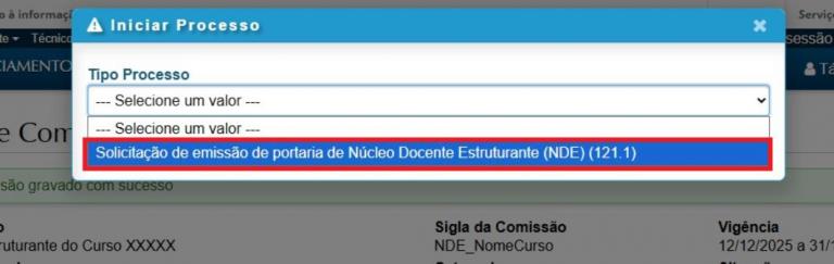 6 – Selecionar o Tipo Processo (121.1) “Solicitação de emissão de Portaria de Núcleo Docente Estruturante (NDE)”.
