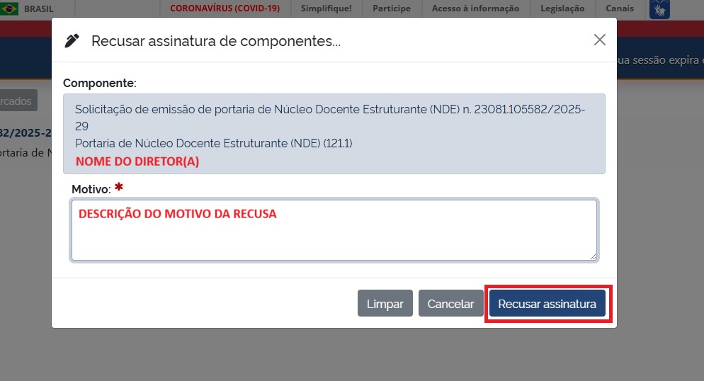 8.3 – Em caso de impedimento funcional (férias, afastamentos, etc) e/ou solicitação de correções, será necessário clicar em  “Recusar Assinatura” e preencher o campo “Motivo” com a devida justificativa e/ou mudanças necessárias.