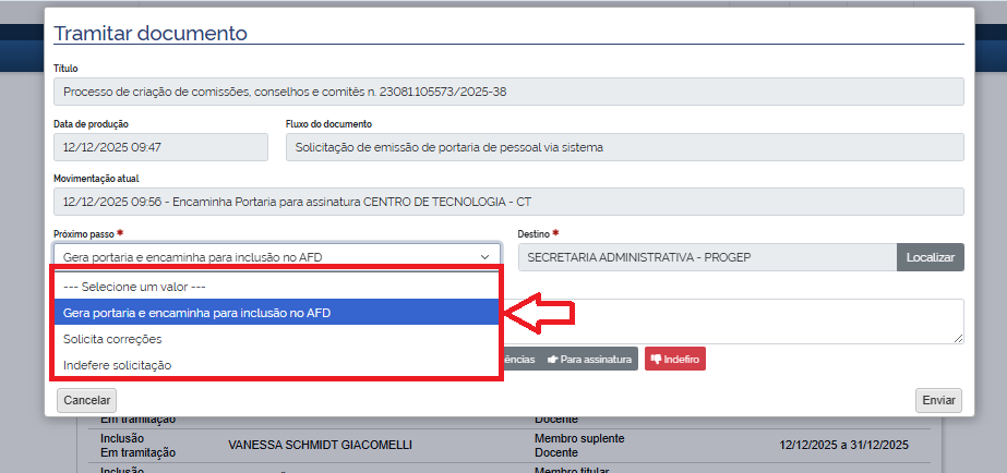 As opções de Tramitação serão listadas no campo “Próximo passo”: