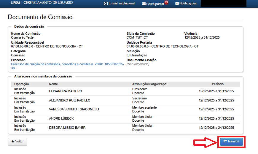 9 – Após a assinatura do(a) Diretor(a) de Centro, o documento retorna para o(a) secretário(a) da unidade para dar seguimento à tramitação, ao clicar em “Tramitar”.