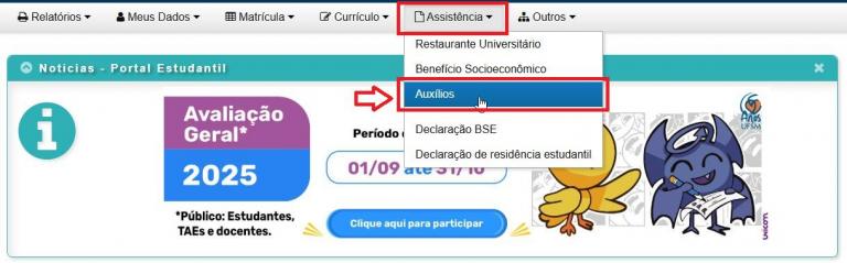 2 – Clique em “Assistência” e depois em “Auxílios”.