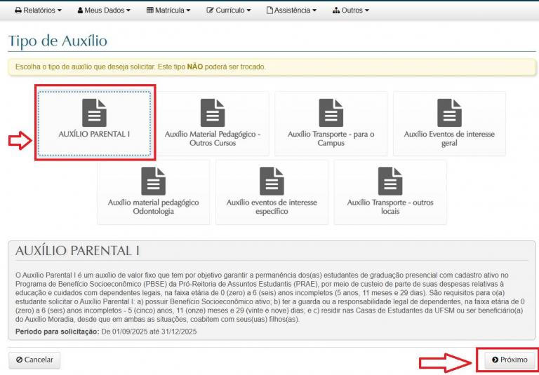 4 – Selecione o Tipo de Auxílio Parental (vide Edital PRAE/UFSM).
