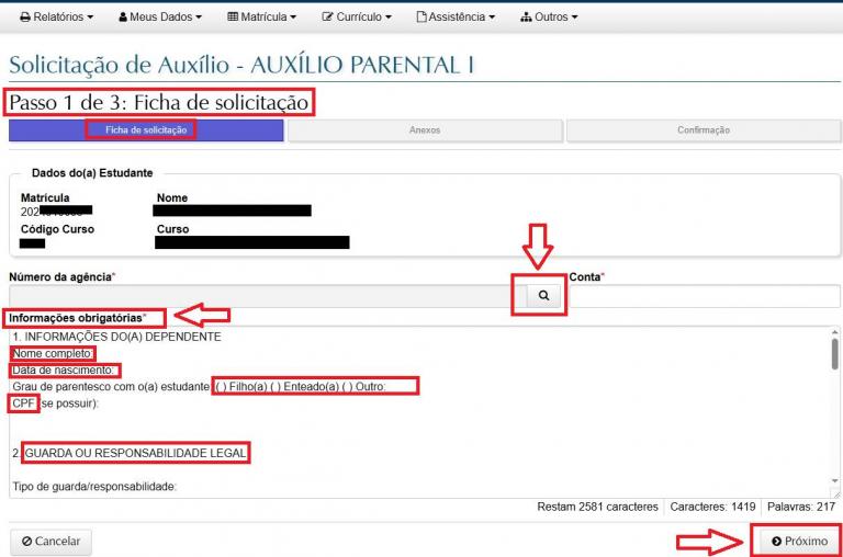 12 – Acompanhe o Status de andamento e consulte seu ‘Processo de auxílio parental a estudante de graduação’, acessando a Aba ‘Auxílios’ do Portal Estudantil.