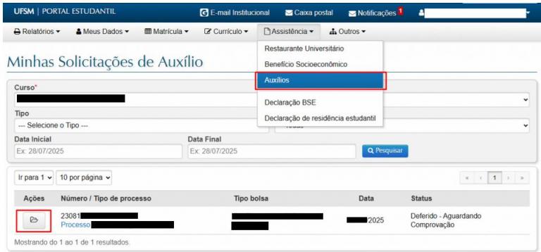 Clique no ícone em formato de pasta na página de ‘Minhas Solicitações de Auxílio’, para conferir os detalhes do processo.
