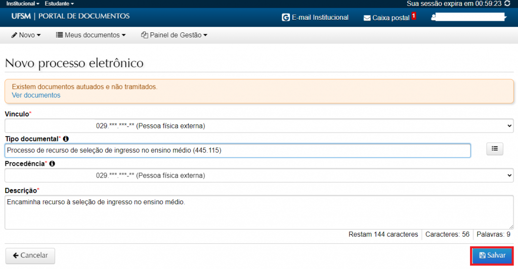 3 – No campo “Tipo Documental”, procurar e selecionar ‘Processo de recurso de seleção de ingresso no ensino médio (445.115)’ ou ‘Processo de recurso de seleção de ingresso no ensino técnico (456.115), conforme o nível de ingresso de interesse do candidato. Após, clicar em “Salvar”.