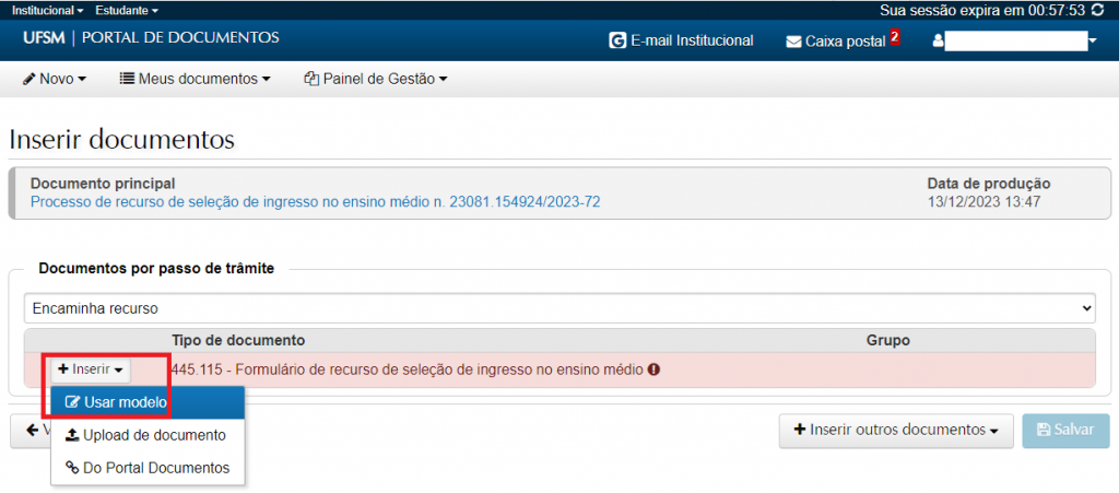 5 – Na tela ‘Documentos por passo de trâmite’ já aparecem quais os documentos são obrigatórios, sendo que não é possível avançar sem que estes sejam incluídos. Para adicionar, você deve clicar no ícone  “+Inserir”, que aparece à frente do documento e clicar em “Usar modelo”.
