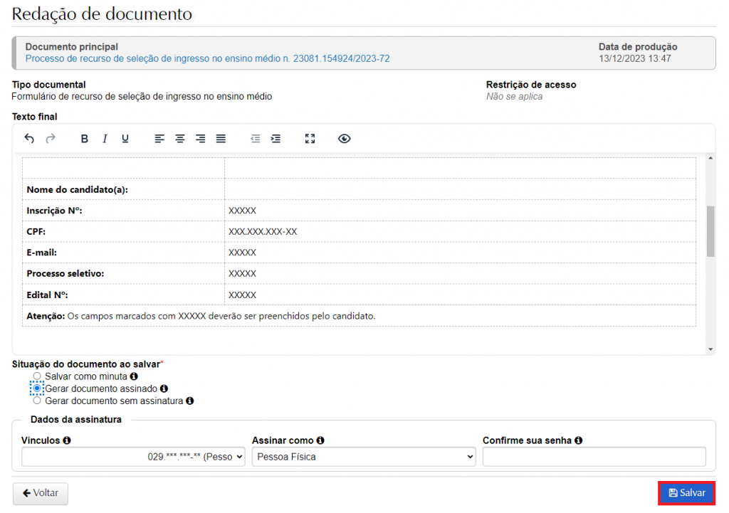 6 – Na tela “redação de documento”, preencher os dados solicitados e seguir as orientações disponíveis aqui . Selecionar “Gerar documento assinado” e após selecionar o vínculo correto (usuário externo) para assinatura e clicar em “Salvar”.