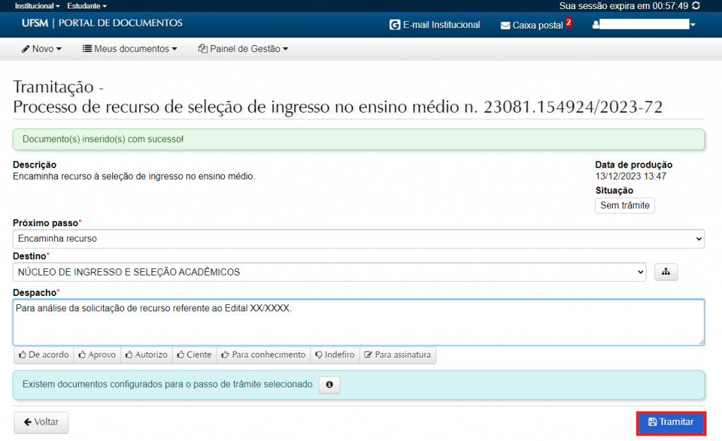 9 – Ao abrir a tela de tramitação, os campos virão pré-preenchidos.