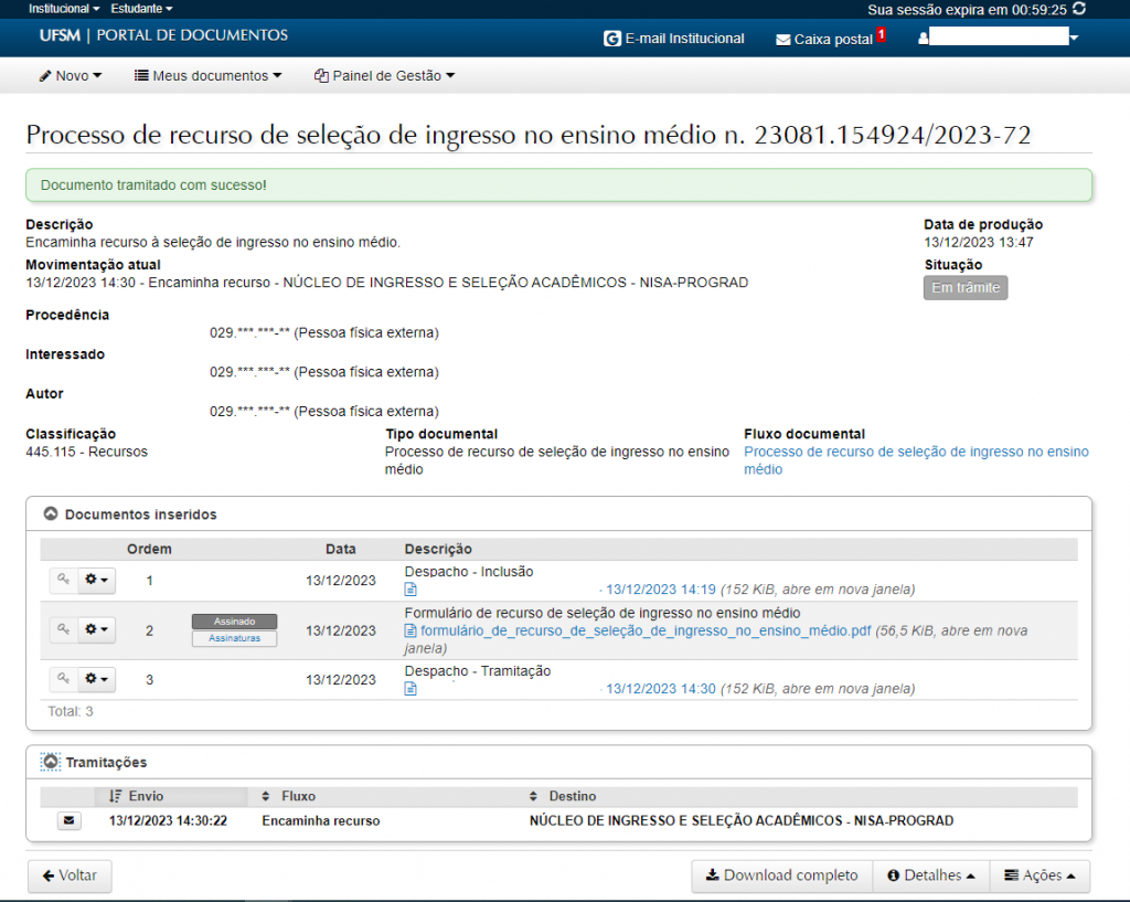Este tutorial se refere aos processos de recurso de seleção de ingresso no ensino médio e aos processos de recurso de seleção de ingresso no ensino técnico. O próprio candidato interessado deverá efetuar a abertura do processo no PEN-SIE/UFSM, na modalidade de seu interesse.