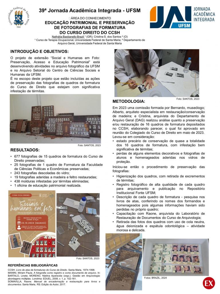 Em 27 de novembro de 2024, no mezanino do Centro de Convenções, o banner “Educação Patrimonial e Preservação de Fotografias de Formatura do Curso de Direito do CCSH” foi apresentado por Nathalia Bastianello Brazil, acadêmica Terapia Ocupacional e bolsista do projeto, na Área de Ciências Sociais Aplicadas – Direito no 19º Salão de Extensão da Universidade Federal de Santa Maria, evento paralelo a 39º Jornada Acadêmica Integrada (JAI/UFSM).