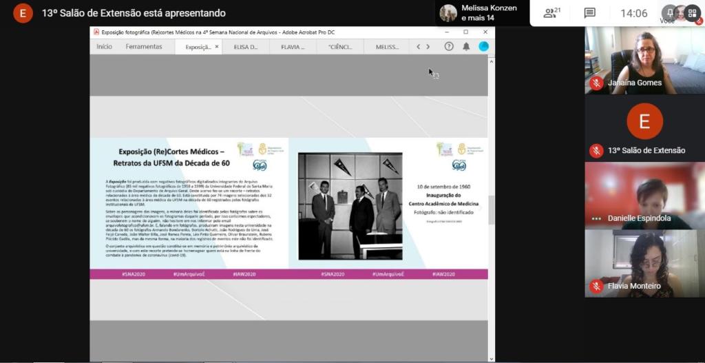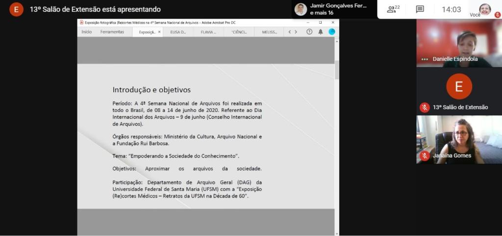O Departamento de Arquivo Geral esteve representado no 13º Salão de Extensão evento integrante da 35ª Jornada Acadêmica Integrada (JAI) na tarde de 22 de outubro com duas apresentações de comunicações na modalidade online. A avaliadora da sala foi a Profa. Dra. Janaina Gomes, da área de Comunicação Social do Campus de Frederico Westphalen.