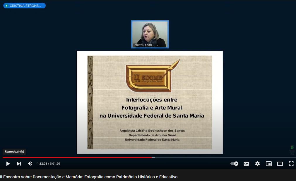 Na manhã de 08 de junho, no eixo temático I – A fotografia no conceito das artes, a comunicação “Interlocuções entre fotografia e arte mural na UFSM” foi apresentada por Cristina Strohschoen dos Santos, arquivista do Departamento de Arquivo Geral. As falas desta manhã estão disponíveis no link II Encontro sobre Documentação e Memória: Fotografia como Patrimônio Histórico e Educativo – YouTube