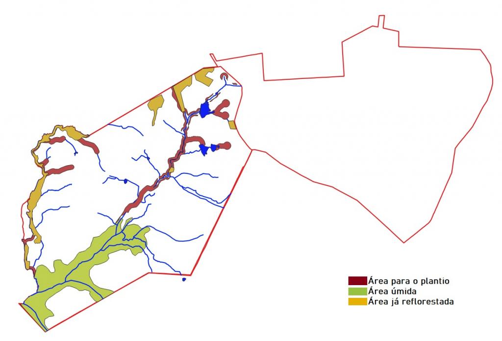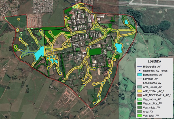 Desse montante, de acordo com as especificações de caracterização de Áreas de Preservação Permanente, Capítulo II da Lei Nº 12.651/2012, há um total de 297,2 ha de APPs, onde 152,3 ha já estão estabelecidos entre áreas com vegetação arbustiva e/ou arbórea e áreas úmidas, restando 144,9 ha com necessidade de recomposição. Veja na figura 1 a delimitação de toda Área de Preservação Permanente da UFSM.