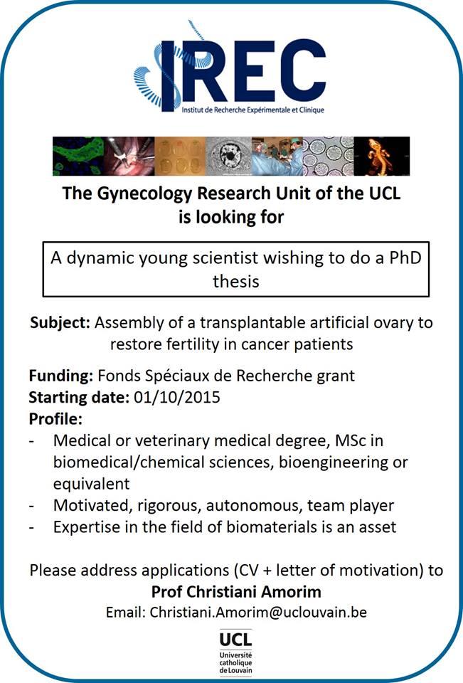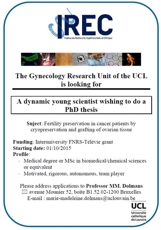O Institut de Recherche Experimentále et Clinique (IREC) está oferecendo bolsa de doutorado para trabalhar na Bélgica, na área de Folículos Pré-antrais. Cursos de Medicina, Medicina Veterinária, Biologi e áreas afins podem estar dentre as interessadas.