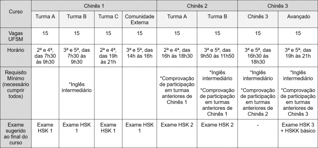 Resumo das vagas, dias e horários das aulas, requisitos mínimos e exames HSK sugeridos: