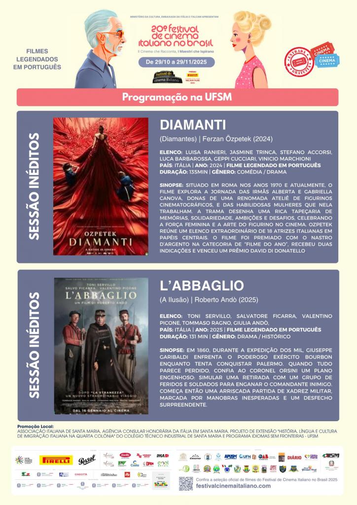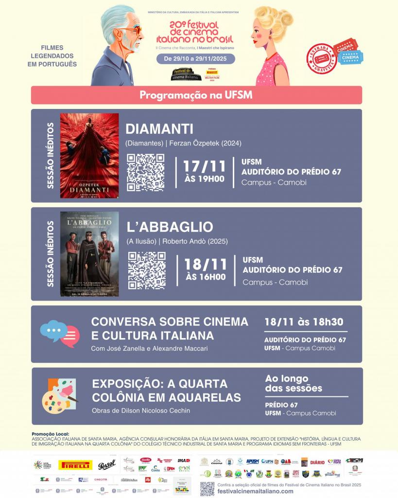 A UFSM participa deste grande evento promovendo a exibição presencial de dois filmes inéditos (conforme programação abaixo). Logo após o término do filme do dia 18, ocorrerá também a Conversa sobre Cinema e Cultura Italiana, com o José Zanella (representante da Agência Consular de Santa Maria) e Alexandre Maccari (Pesquisador de História do Cinema e Cinéfilo). Paralelamente, durante todo o período de exibição dos filmes, estará acontecendo no mesmo local uma exposição de arte denominada “A Quarta Colônia em Aquarelas”, com obras de Dilson Nicholoso Cechin.