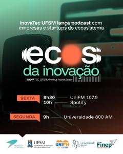 O InovaTec UFSM Parque Tecnológico iniciará, nesta sexta-feira (6), a veiculação da primeira temporada de Ecos da Inovação, um podcast do Parque em parceria com as emissoras de rádio da Universidade. O primeiro episódio sairá às 8h30 na UniFM 107.9 e às 10h no perfil do Spotify. Além disso, o programa também será veiculado na Rádio Universidade 800 AM, segunda-feira às 9h.