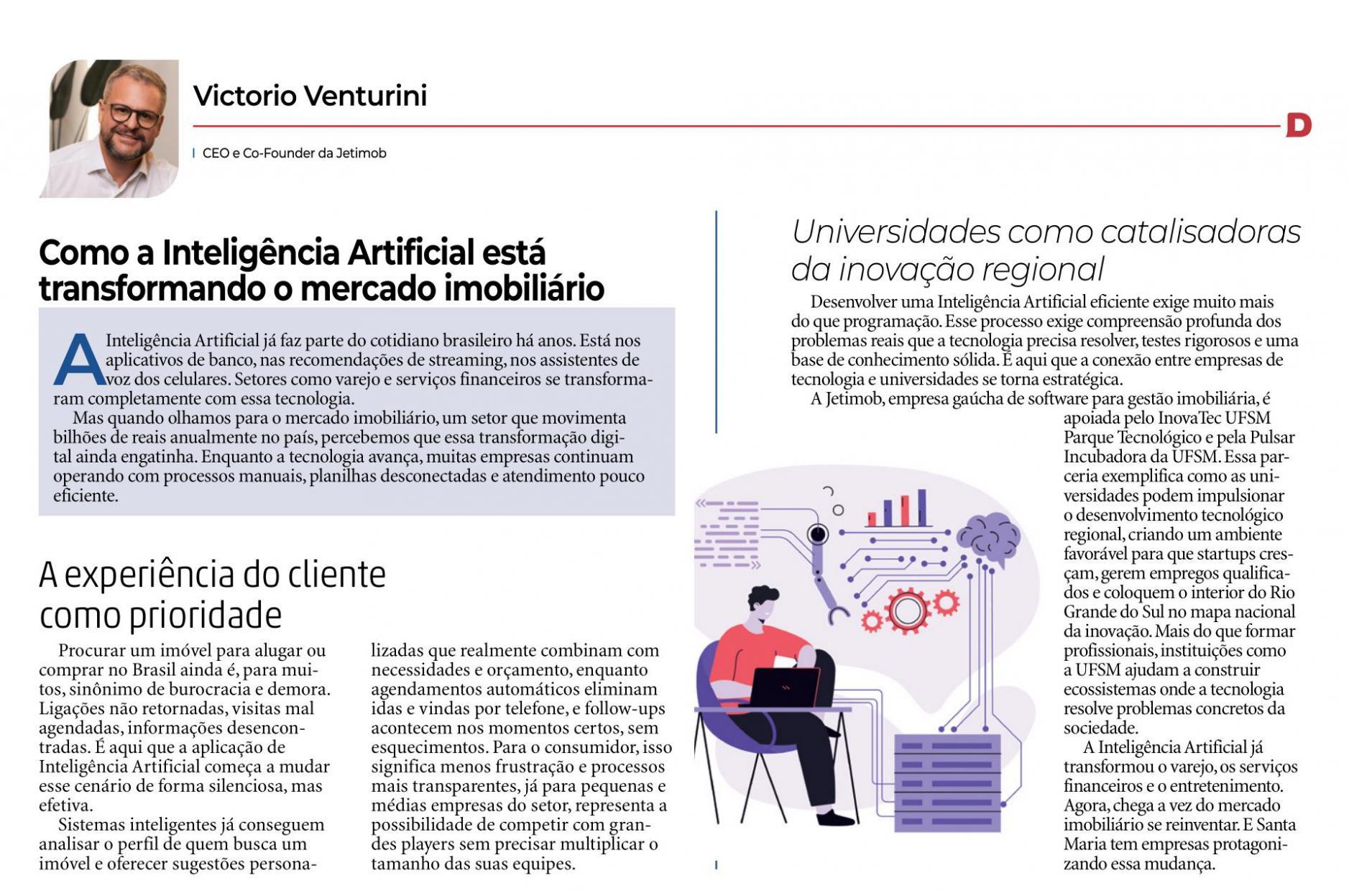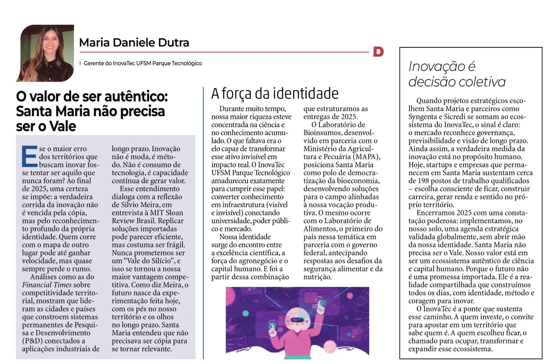 A Pró-Reitoria de Inovação e Empreendedorismo da UFSM (PROINOVA) possui uma coluna no Diário de Santa Maria, para publicar artigos sobre ações relacionadas à inovação, empreendedorismo e tecnologia. O espaço é aberto à equipe, pesquisadores e servidores envolvidos nessas ações. Desde 2024, o InovaTec UFSM Parque Tecnológico abriu o espaço para empreendedores integrantes do ecossistema de inovação da UFSM publicarem artigos na coluna.