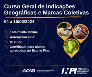 O objetivo deste curso e que o participante, ao final do curso, seja capaz de identificar o que são indicações geográficas, diferenciando-as das marcas coletivas; reconhecer as diferenças entre a indicação de procedência e a denominação de origem; e identificar corretamente os usos delas em casos concretos. Além disso, deverá ter noções do que consistem os pedidos de registro de marcas coletivas e de indicações geográficas. Período de inscrição: até 03/03 ou até o preenchimento das vagas disponíveis. Cadastro e Inscrição através do link. |