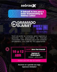 Gramado Summit 2024. O SebraeX te leva para o maior brainstorming da América Latina. Você vai poder se conectar, gerar negócios e aprender com especialistas do mercado corporativo. Dias 10 a 12 de abril. Local: Serra Park Gramado. Mais informações no link. |