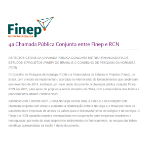 Alinhados com o acordo BN21 (Brasil-Noruega Século XXI), a Finep e o RCN lançam esta chamada conjunta com vistas a aumentar a colaboração entre a Noruega e o Brasil por meio de parcerias entre empresas de ambos os países para o desenvolvimento tecnológico e de serviços. A Finep e o RCN apoiarão projetos desenvolvidos em cooperação entre empresas brasileiras e norueguesas, por meio de seus respectivos instrumentos de financiamento, no escopo das linhas temáticas apresentadas no edital. Prazo para envio 24/04/2024. Link. |