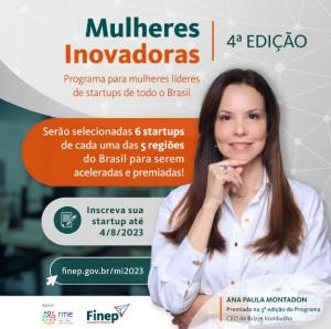 O programa Mulheres Inovadoras está de volta! A 4ª edição do Programa Mulheres Inovadoras foi lançada com o objetivo estimular startups lideradas por mulheres, de forma a contribuir para o aumento da representatividade feminina no cenário empreendedor nacional.Inscreva-se até o dia 4 de agosto.  →