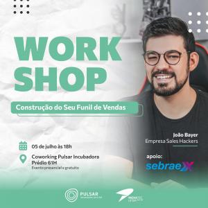 3° Workshop com tema de Construção de funil de vendas, vai ser muito importante para startups que estão em fase de operação e pretendem dar um up na máquina de vendas, conseguir novos clientes e expandir sua empresa. Nosso ministrador João Bayer trabalha com consultoria na área de vendas a bastante tempo e compartilhará seu conhecimento conosco. Para participar basta se inscrever aqui.