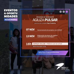 Programa de Workshops Agiliza Pulsar Em parceria com o projeto Papo Produtivo, apresentamos o Programa de Workshops Agiliza Pulsar, promovido pela Pulsar Incubadora Tecnológica da UFSM. Os workshops acontecem nos dias 7 e 13 de novembro. Se você é empreendedor, faz parte de uma empresa incubada ou simplesmente tem interesse em aprender, esta é a sua chance! Inscreva-se. |