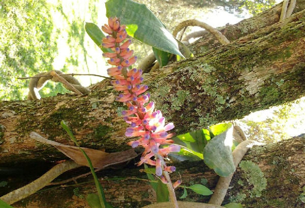 As bromélias, plantas nativas das Américas, apresentam em geral inflorescência vistosa e folhas distribuídas em roseta, que propiciam a formação de um reservatório de água e nutrientes. Elas pertencem à família Bromeliaceae, que corresponde à quarta família de Angiospermas com maior riqueza de espécies do domínio da mata atlântica.