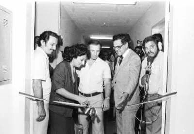 No registro fotográfico, da direita para a esquerda: Jornalista Norton Ceza, Reitor na época Derblay Galvão, Nicola Chiarelli Garófalo (Diretor da Rádio Universidade na época) e Luiz Fernando Vinadé (Departamento de divulgação).